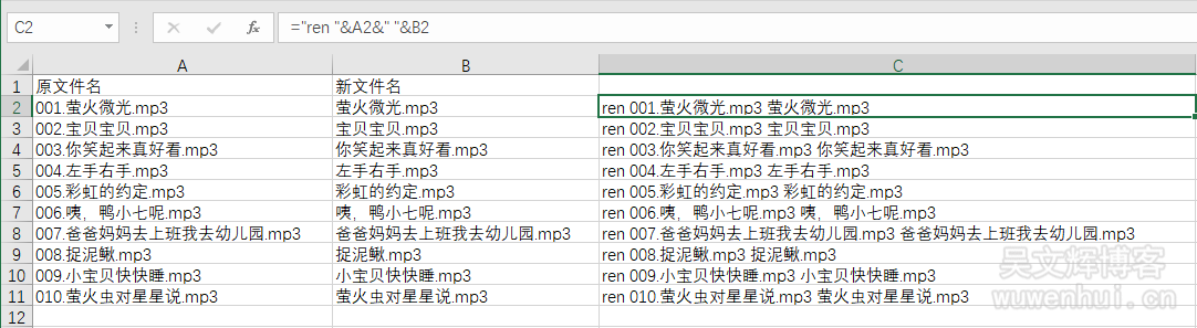 4、接下来我们为了让事情更加简单,这里新建一个excel文件,然后在C列中输入公式=”ren “&A2&” “&B2,公式表示将A列和B列的字符串进行连接,如下图: