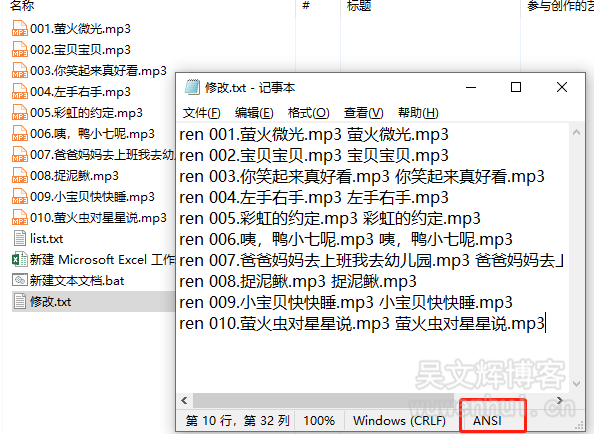 5、再次在该文件目录下新建一个文本文档(修改.txt),然后将刚才在excel中最终得到的C列复制粘贴到该文本文档中,另存编码选择ANSI,如下图: