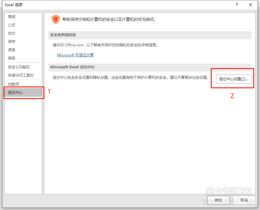 4、在选项中选择【信任中心】→【信任中心设置】,如下图所示。