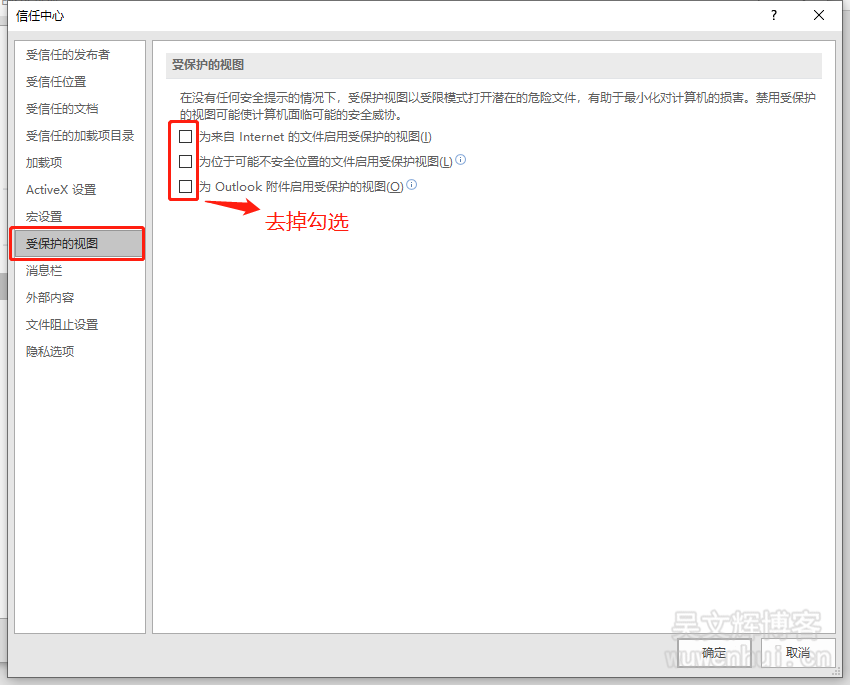 5、在信任中心设置边栏选择受保护的视图,将下图所示的三个复选框去掉勾(不勾选),点击确定按钮即可,重新打开,就可以正常使用了!