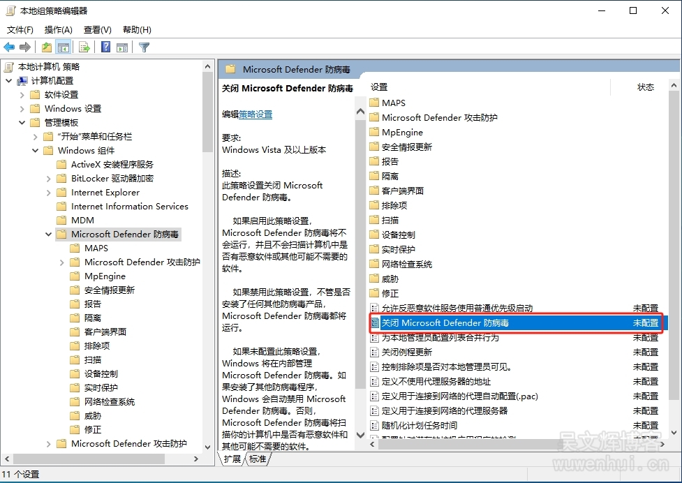8、在【本地组策略编辑器】-【计算机配置】中依次打开【管理模板】、【Windows组件】、【Microsoft Defender防病毒】,在【Microsoft Defender防病毒】中双击【关闭Microsoft Defender防病毒】;