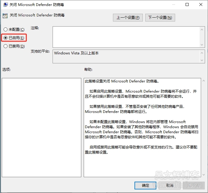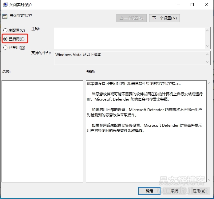 13、双击【关闭实时保护】,选择【已启用】,点击【应用】,然后点击【确定】;