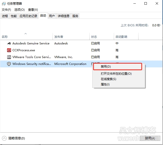 16、鼠标右击任务栏,点击【任务管理器】,点击【启动】,选中【windows…】,鼠标右击点击【禁用】。