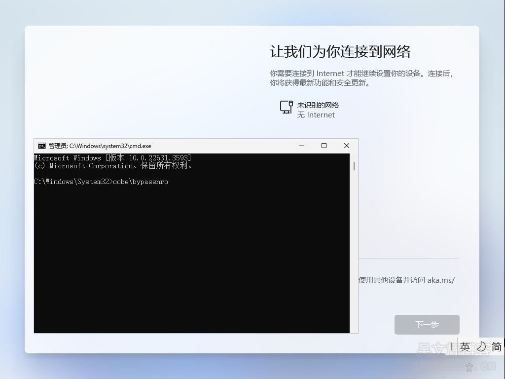 2、输入:oobe\bypassnro 然后回车,或者oobe\bypassnro.cmd 然后回车;