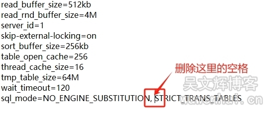2、找到sql_mode配置项,将红框处的空格删除保存即可。
