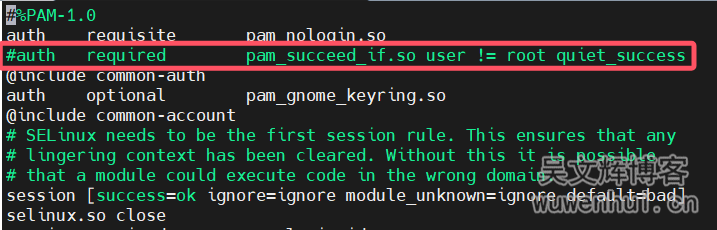 2、编辑/etc/pam.d/gdm-password文件,把auth required pam_succeed_if.so user != root quiet_success这一行注释掉;