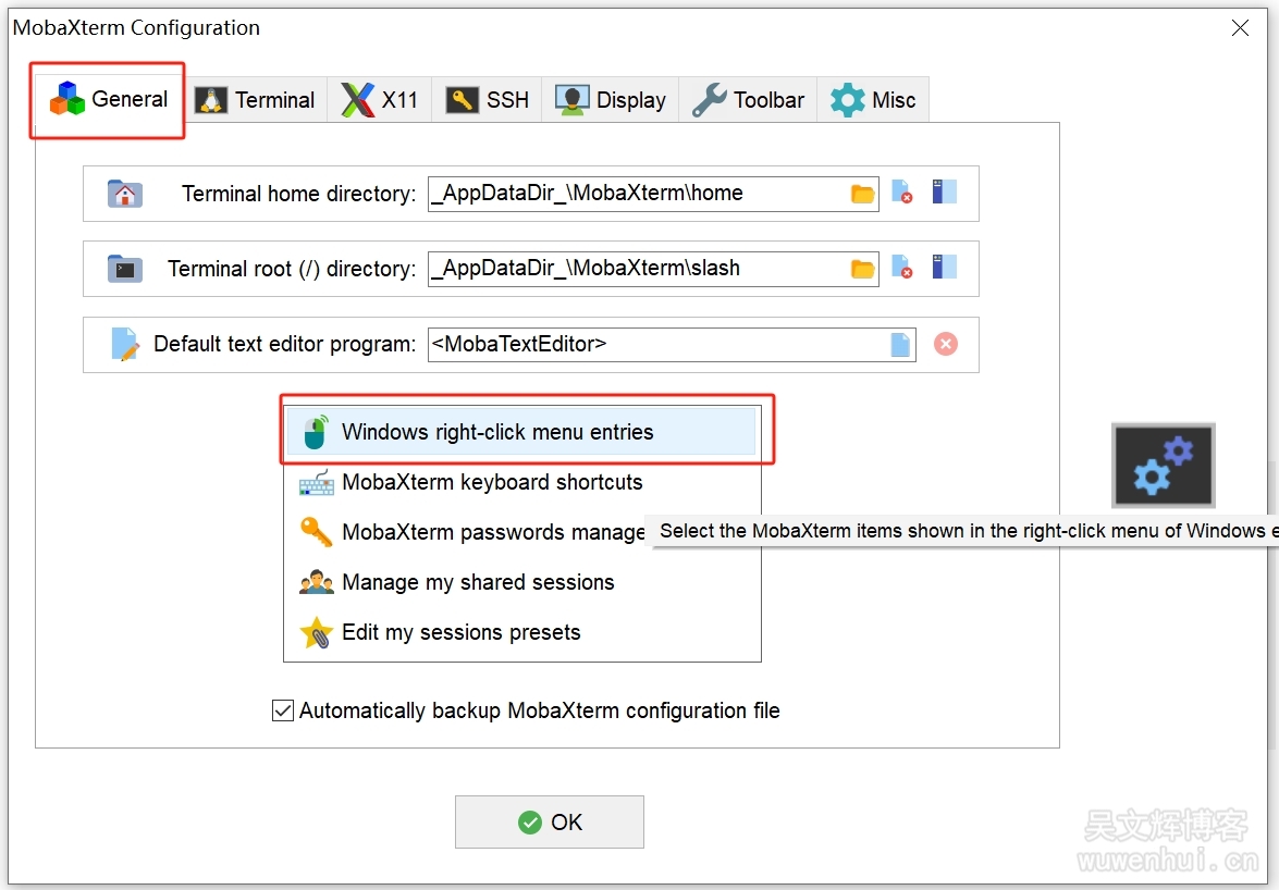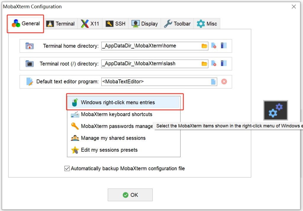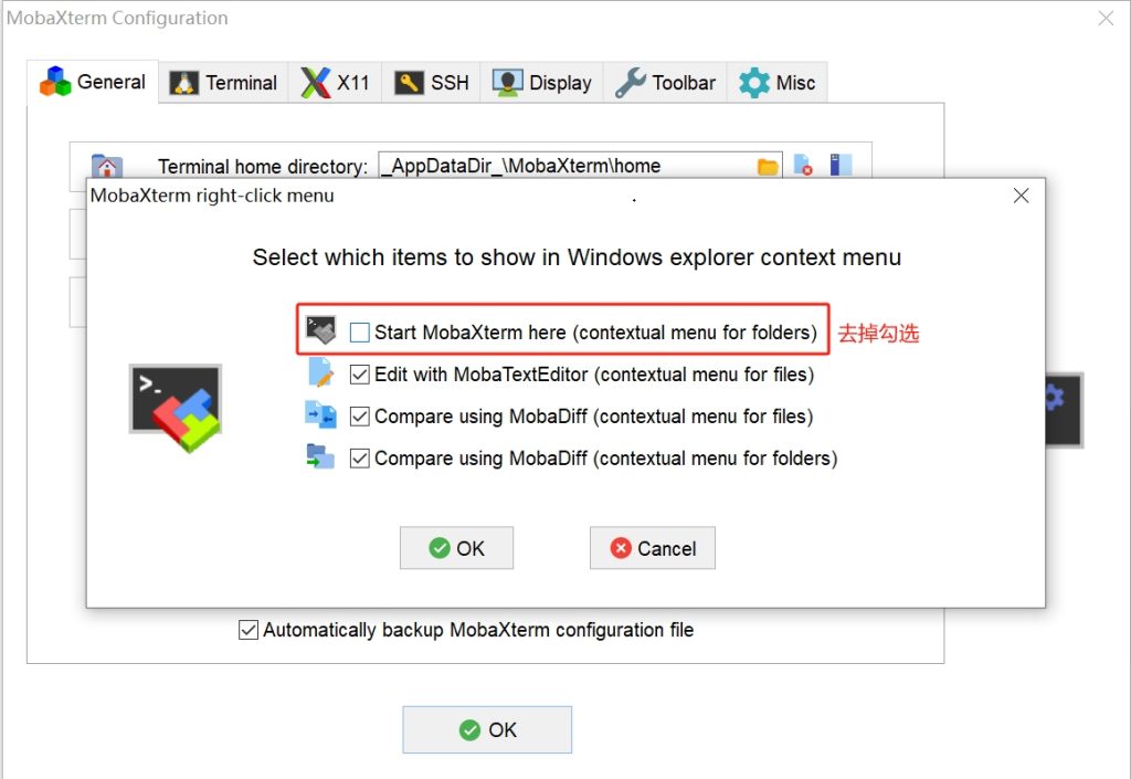 打开MobaXterm软件,【Settings】-【Configuration】-【General】-【Windows right-click menu entries】,去掉Start MobaXterm here(contextual menu for folders)勾选。