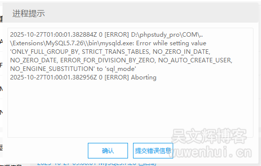 2025-10-27T01:00:01.382884Z 0 [ERROR] E:\phpstudy_pro\COM…\Extensions\MySQL5.7.26\bin\mysqld.exe: Error while setting value ‘STRICT_TRANS_TABLES, NO_ZERO_IN_DATE, NO_ZERO_DATE,ERROR_FOR_DIVISION_BY_ZERO, NO_AUTO_CREATE_USER, NO_ENGINE_SUBSTITUTION’ to ‘sql_mode’