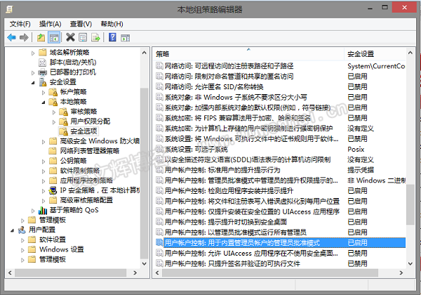 windouws 8 放出来有段时间了,相信很多人都和我一样喜欢直接用内置的管理员账户,但是这就出现一个问题,在使用这个账户的时候,开始菜单(磁贴)应用程序没有办法激 活,也就是说开始菜单很多程序用不了,挠头啊,但是今天潜心研究发现一个办法,在运行中输入:“gpedit.msc”,就会启动组策略编辑器,依次展开 “计算机配置”里面的“Windows设置”,然后是“安全设置”,再就是“本地策略”里面的“安全选项”,在右边查找一项策略:“用户帐户控制: 用于内置管理员账户的管理员批准模式”,双击打开更改为“已启用”,确定后退出注销或重启再登录,就OK了。