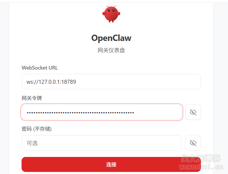 3、将token复制到web页面的网关令牌中,点连接: